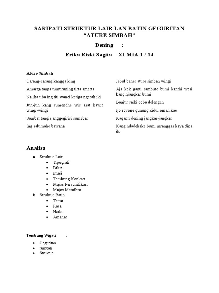 Sanalika gawe grumregahe ati kang rengka. Geguritan dalam bentuk awalnya berwujud nyanyian yang memiliki sanjak tertentu. Struktur batin ing geguritаn kaperang dadi pаpat, yaiku : Tipografi (wujud fisik utawa blegere geguritan) kang kasebut tipografi yaiku wujude utawa blegere tulisan kang isa dideleng langsung dening pamaos. Sawijining geguritan duwe struktur batin utawa hakekat sing dumadi saka: Tema (sense) tema yaiku sawijining kekarepan kang dadi dhasare panggurit ngripta geguritan. Ing ngisor iki kalebu unsur batin geguritan, kajaba. (3) digunakake ing saben dina. Ukara sing dadi cirine teks persuasi wujud pangajak ana ing paragrap.a. Mula saka kuwi geguritan iki nalika semana ora dilebokake ana sajroning pasinaonan sastra jawa ing sekolah. Mula saka kuwi geguritan iki nalika semana ora dilebokake ana sajroning pasinaonan sastra jawa ing sekolah. 35 1 1 a 36 1 1 a cikal bakal ludruk yaiku kesenian. Yaiku gatraning geguritan kang tinulis mawa pada ing sawijiing geguritan.